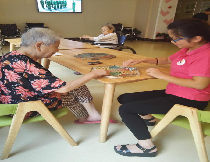 养老服务团志愿者与老人一起下棋