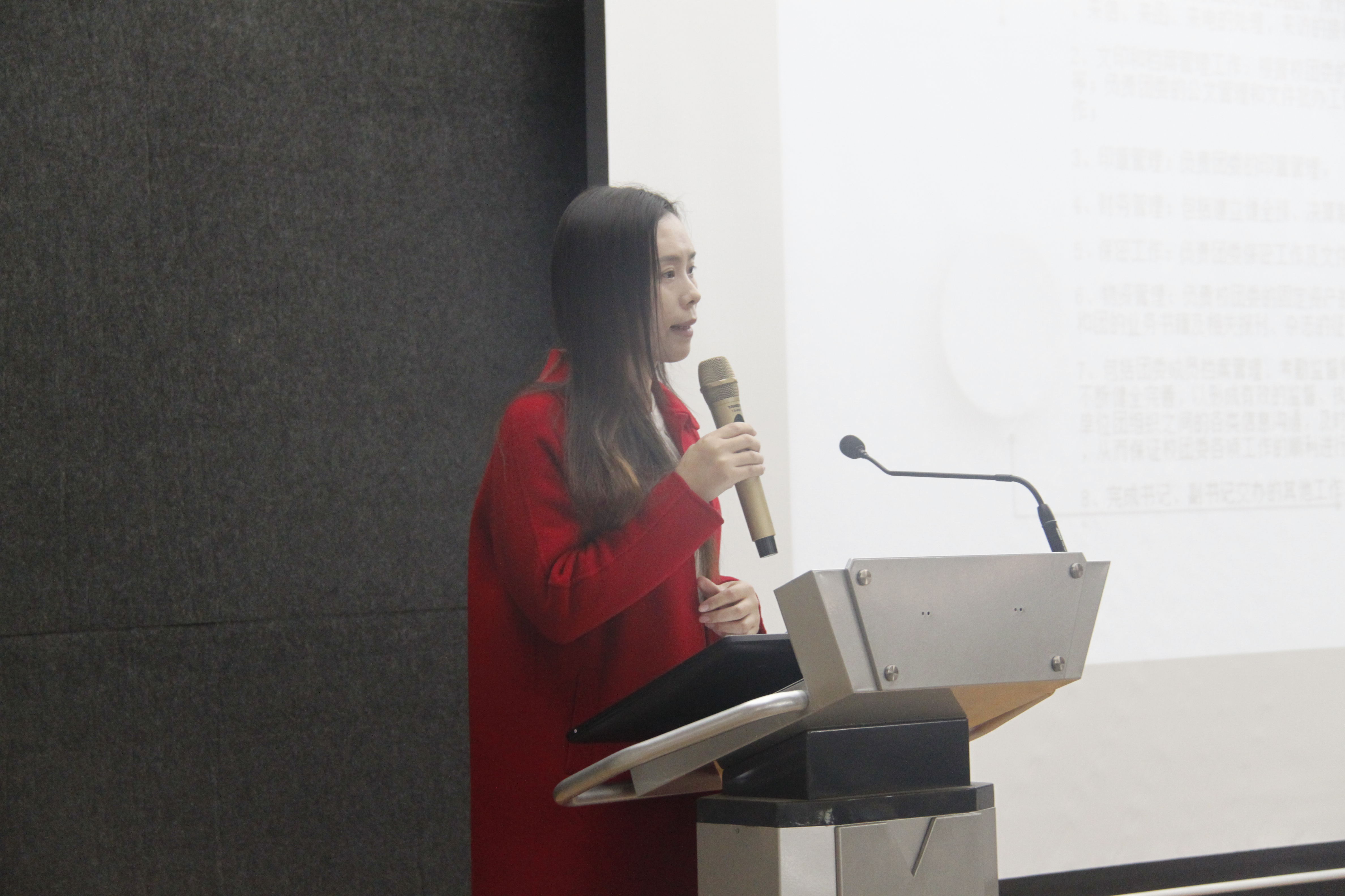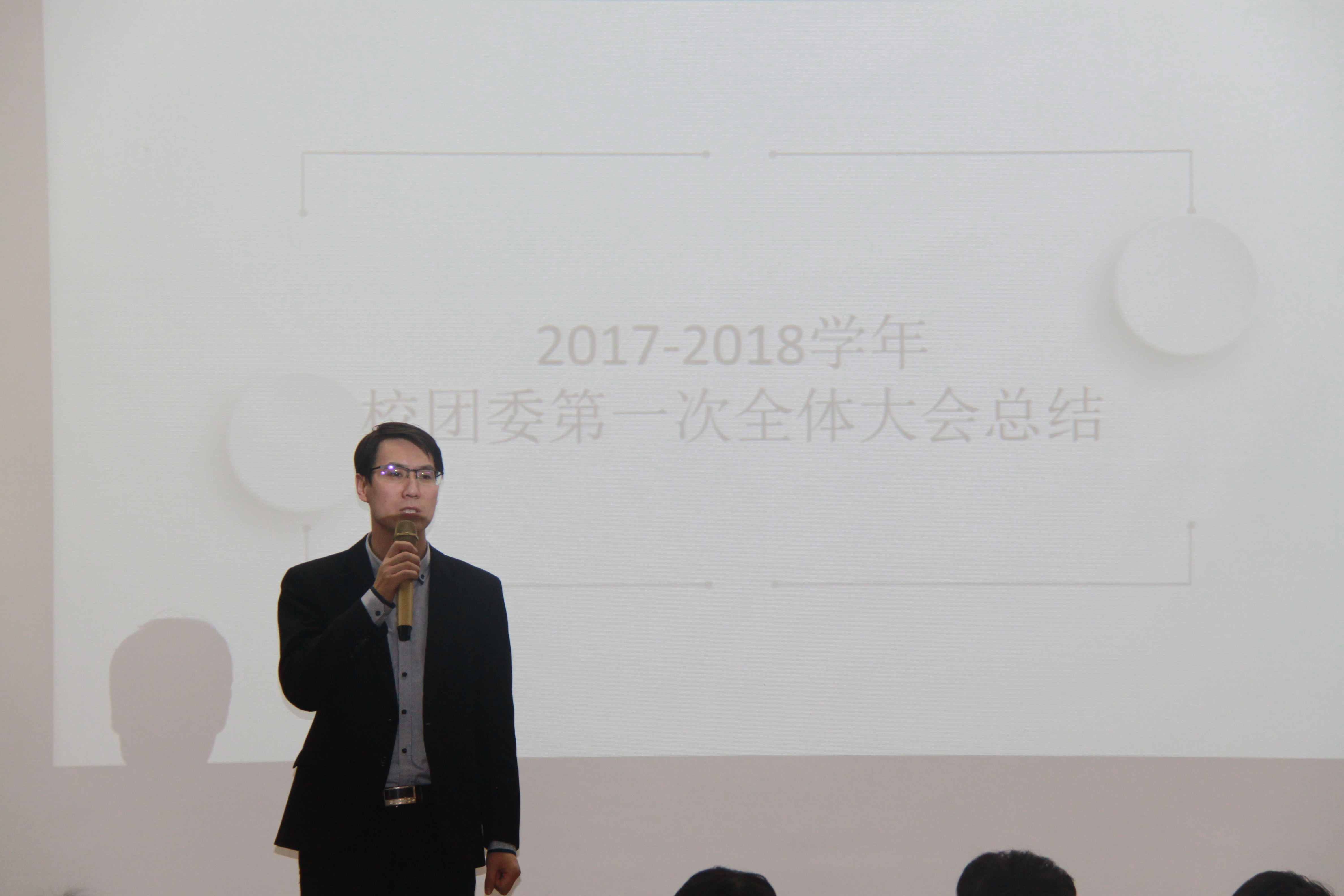 会议开始,主持人孙雨介绍此次会议主要内容及目的。接着,主讲人李小玲上台致开场白。伴随着PPT放映的五大部门部门结构、职责及分工,五大部门的部长、副部长依次上台介绍自己并简单阐述所负责工作。李小玲表示校团委将在近期成立“新媒体中心”,同时强调新媒体对当今社会的重要性。李小玲表示“校团委是五个组织的集合,要依靠团体的力量”并提醒大家做好各部门的对接工作。最后李小玲指出:作为一名团学干部应该具备更高的的素质和政治觉悟。