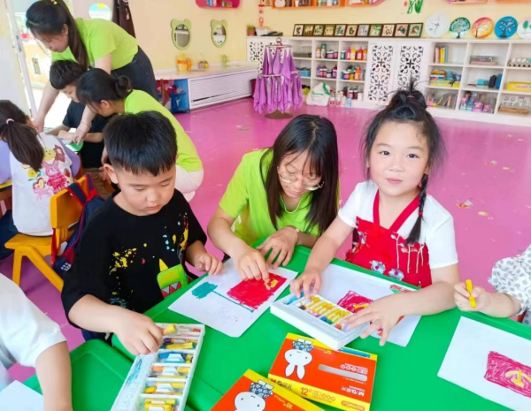 迎着清晨的第一缕阳光,同学们乘坐德英国际幼儿园校车整装待发。本次活动采取分组形式,7个小组分别进入幼儿园班级进行“爱党爱国”主题教育的宣讲。首先,志愿者们通过讲述中国共产党诞生的历程,英雄人物王二小、小萝卜头宋振中的故事以及党旗的由来与意义,极大的激起了孩子们的好奇心,加深了他们对祖国的认识,让爱国的种子在孩子们心中生根发芽。然后,志愿者们趁热打铁,组织幼儿进行了一次特别的党旗绘画活动。活动期间,孩子们和“小老师们”亲切的交流与互动,不仅激发了同学们对教育事业的兴趣与热爱,也使孩子们爱国主义情感的萌芽得以浇灌,让祖国的光辉形象深深地根植在孩子们的心中。