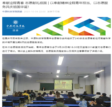 大力推动各类社会实践及志愿公益活动,重点组建了15支校级社会实践团队,团队先后入选全国大学生志愿服务宣讲团6支,全国“七彩假期”志愿服务示范团队1支,河南省大学生红旗渠精神代代传志愿宣讲团队1支,省级“三下乡”社会实践重点团队1支,全国“三下乡”社会实践重点团队1支。同时积极响应社会号召,主动对接学校周边社区资源,开展无偿献血志愿服务和大学生社区实践活动。