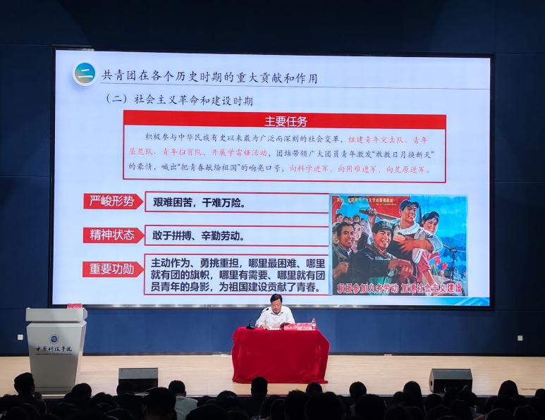 讲座在师生合唱中国共产主义青年团团歌《光荣啊,中国共青团》中开始。谢冰松教授在讲座中系统阐述了共青团在不同历史时期的奋斗历程和重大变革,解读了共青团在各个历史时期的重大贡献和作用,带领大家学习了十八大以来总书记关于青年的一系列论述,以习总书记“党有号召、团有行动”这一行动指南激励和动员团员青年要坚定不移听党话、跟党走,怀抱梦想、脚踏实地、敢想敢为、善作善成。讲座最后,谢教授从共青团的组织定位、基本职能、工作着力点、基本制度、重点任务和活动载体等六个方面,提出了提升共青团工作水平的基本方法和路径。