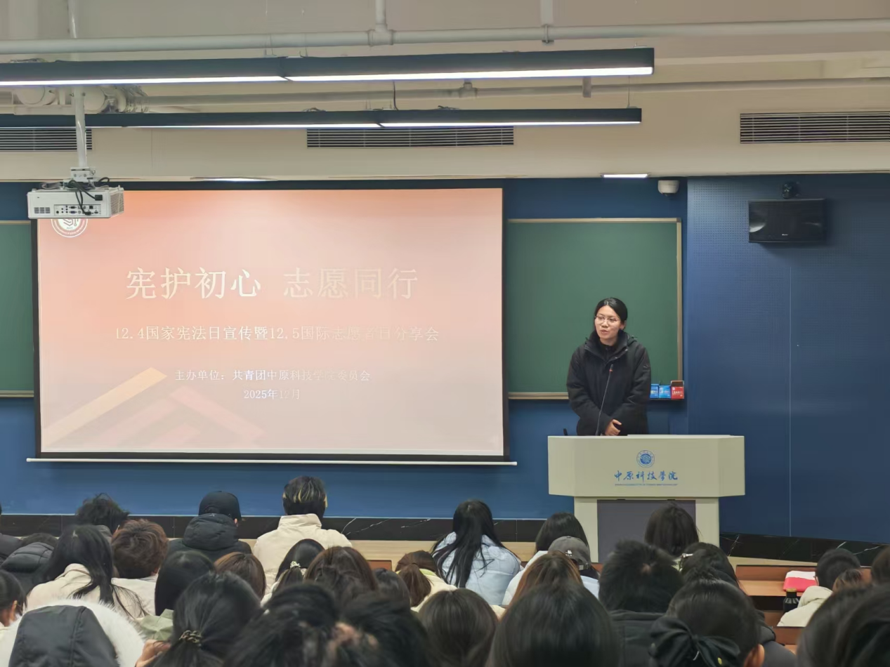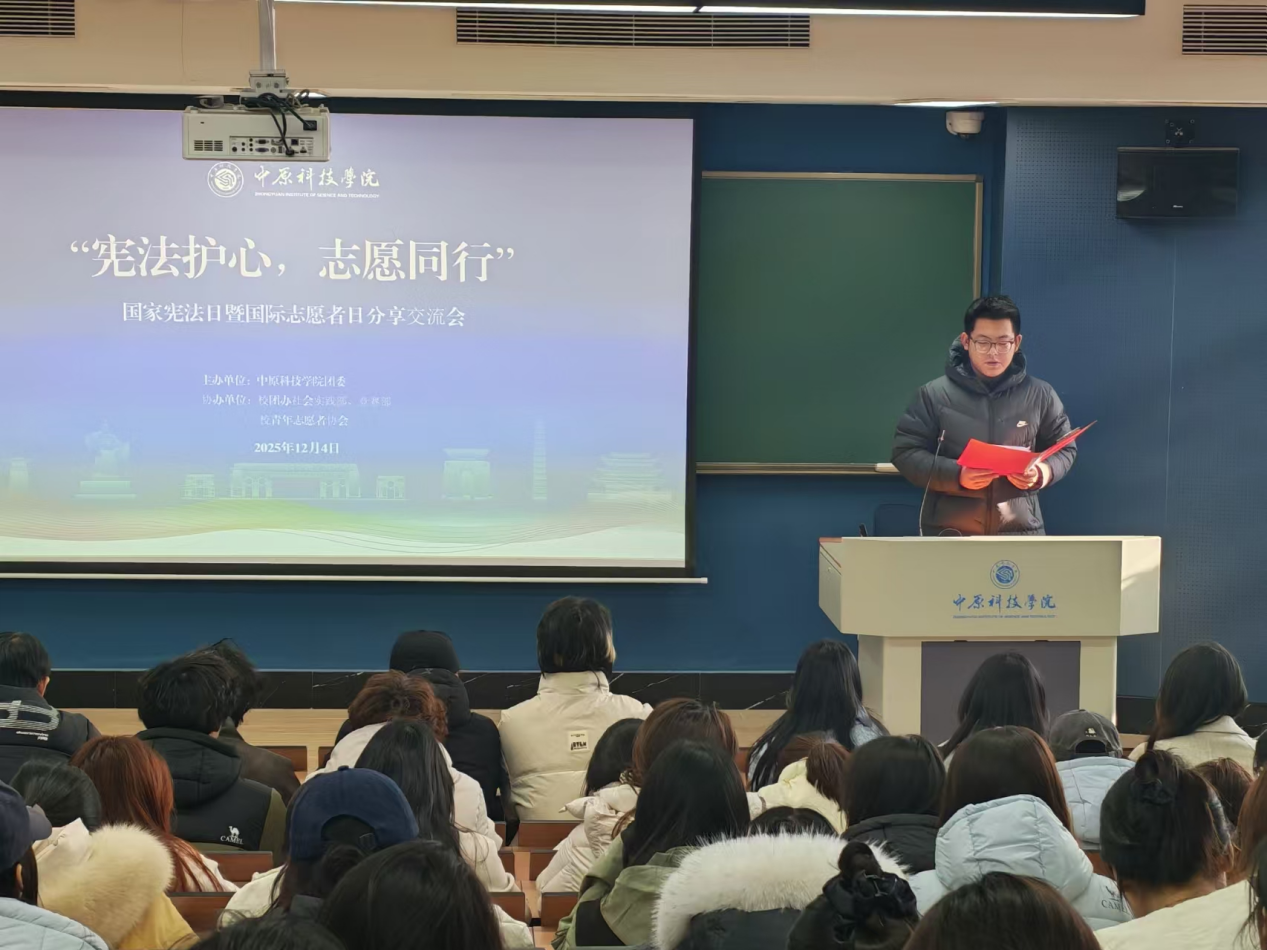 恰逢国家宪法日与国际志愿者日交汇这一重要节点,为深入学习宣传宪法精神,传承弘扬“奉献、友爱、互助、进步”的志愿理念,12月4日下午,中原科技学院校团委在行远楼W301隆重开展“宪法护心,志愿同行”主题分享交流会。活动借国家宪法日与国际志愿者日相继到来之势,将法治教育与志愿精神传承深度融合,为全校师生搭建起学习宪法、感悟奉献的实践平台,充分彰显了校园立德树人的育人初心与时代担当。