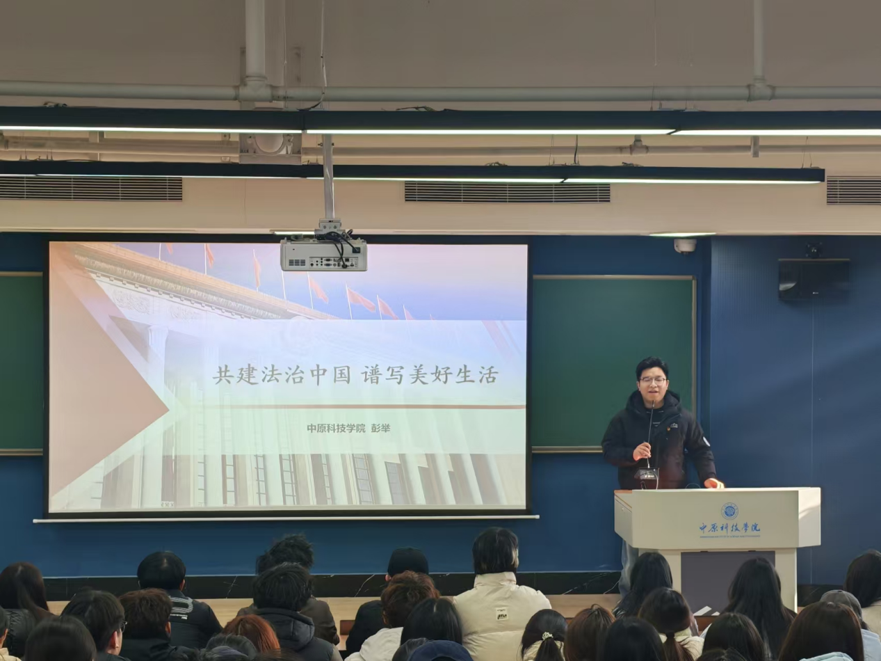 活动伊始,马克思主义学院彭举老师带来了一场生动深刻的宪法知识科普宣讲。他以宪法的核心要义为切入点,系统阐释了宪法的时代价值及其与青年成长的紧密关联,从“依宪治国”的宏观意义延伸至校园生活中的法治细节,层层递进、深入浅出。宣讲不仅让师生对宪法的重要性有了更清晰的认知,更引导青年学子牢固树立“学法、懂法、守法、用法”的法治观念,推动宪法精神内化于心、外化于行。
