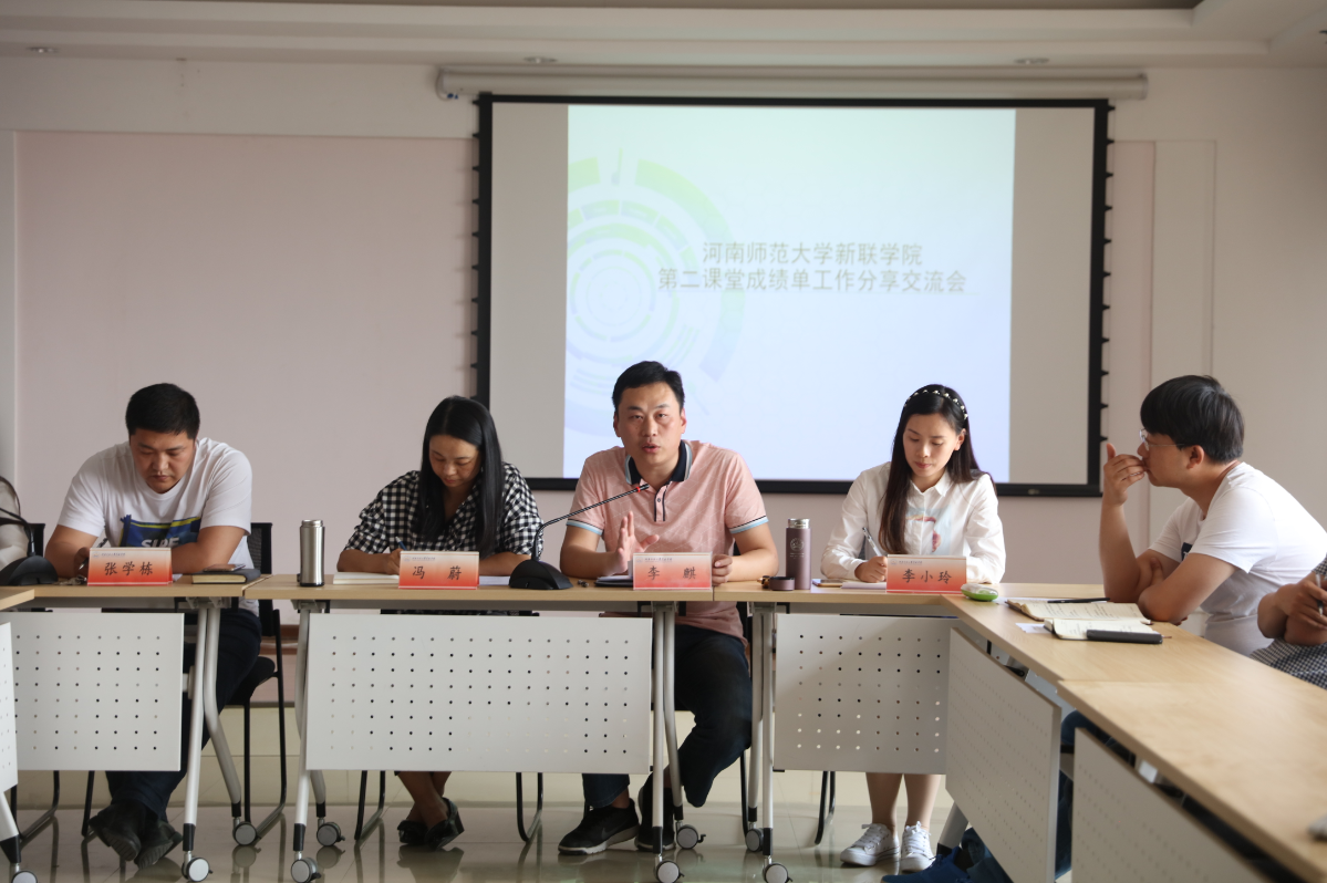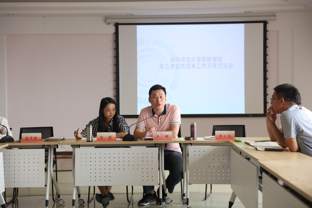 会议伊始,由大学生创新实践实施领导小组办公室李小玲老师对《河南师范大新联学院创新实践学分实施细则(试行)》进行解读,李小玲老师详细的介绍了创新实践学分认定及成绩评定办法和“第二课堂活动成绩单”创新实践学时发放标准。随后,外国语学院团总支书记郭春燕老师就第二课堂工作进行分享交流,其分享主题为“团总支书记如何在第二课堂工作中发挥引导和沟通作用”。郭春燕老师讲解了外国语学院第二课堂实施基本情况和具体实施过程。会议第三项,由艺术学院辅导员刘鑫老师就第二课堂工作进行以“辅导员如何在第二课堂工作中发挥引导和沟通作用”为主题的分享交流。紧接着,教务处副处长、大学生创新实践实施领导小组办公室副主任李麒老师进行讲话,他指出了“第二课堂成绩单”在实施过程中出现的例如各院活动申报不均衡、第二课堂学时赋予标准、学生对第二课堂文件了解不够透彻、各学院宣传不到位、二维码转发签到现象等一系列问题,并做出了恰当合理的解决方案,赢得会场阵阵掌声。会议倒数第二项,由学工处处处长、大学生创新实践实施领导小组活动管理组副组长张学栋老师讲话,他指出,各辅导员老师要提高发展第二课堂的意识并认真学习第二课堂文件内容,以方便为学生解答疑难。张学栋处长同时指出,各辅导员老师要做信息沟通的桥梁,将第二课堂文件内容通过召开正式班会讲解传达给学生。并且,张学栋老师表明,学工处将结合第二课堂成绩单将学院作为试点开展活动,第二课堂操作细节将会在学工处公众号发表。会议最后,由校长助理、教务处处长、大学生创新实践实施领导小组副组长冯蔚老师讲话,冯蔚老师再次强调了第二课堂的重要性并有针对性的提出我校实施第二课堂面临的主要矛盾和问题。在与会嘉宾的深入思考中会议圆满结束。此次会议的顺利召开是我校迈向网络管理的一大步,对我校今后第二课堂线上线下同时进行有重大意义。