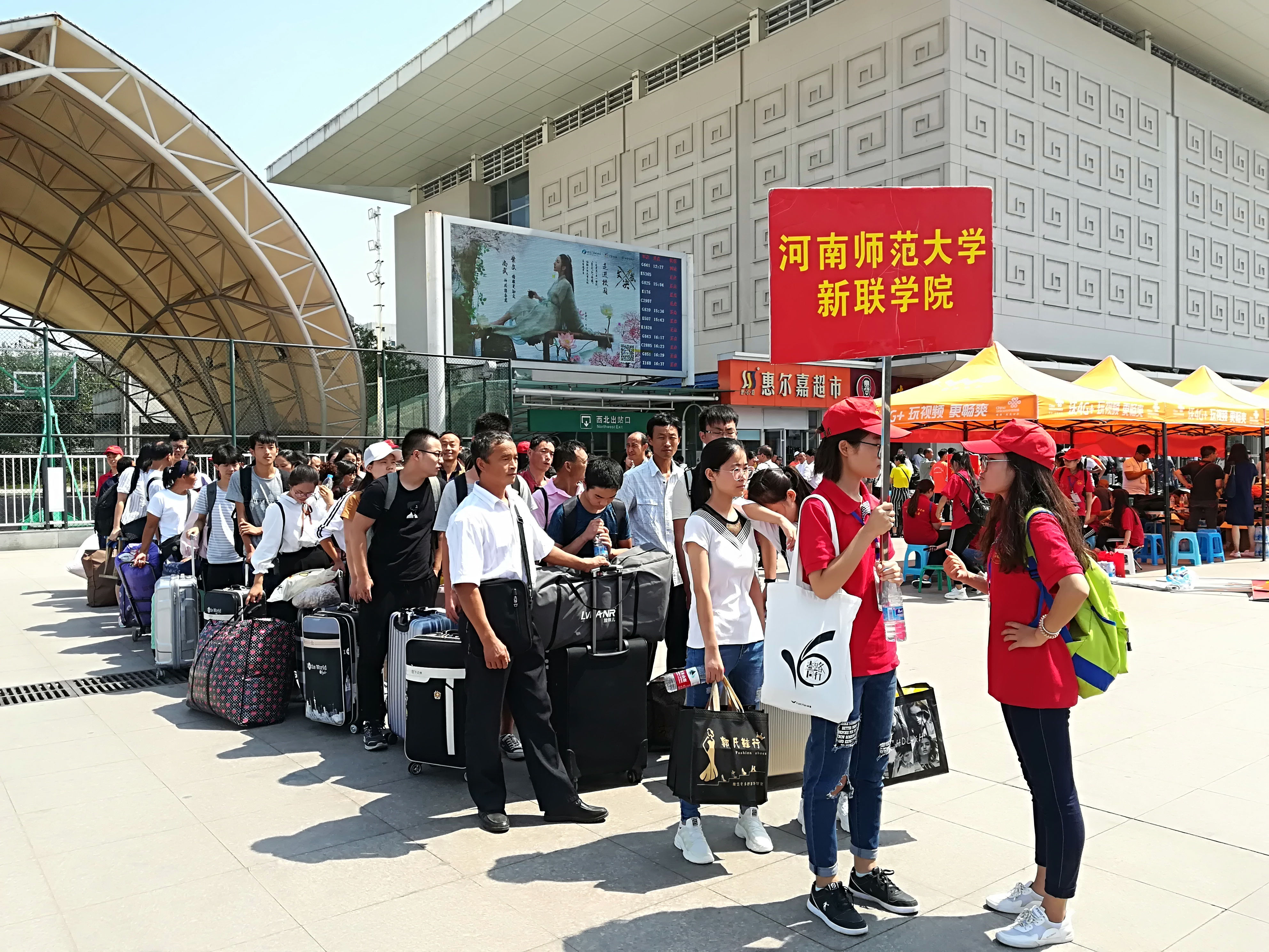 在工作开展之前,我校领导对此工作给予极大重视,事先安排好志愿者的分工与合作,为更好的服务到更多的新生,志愿者们共分为五个迎新组、一个跟车组、两个备用组;并详细介绍火车站的内部结构以便志愿者更能准确无误且及时的接到新生;反复叮嘱志愿者们注重自身财产安全。由于火车站内人流量较大,志愿者们特意分布在各个出站口,以便让新生和家长一眼就能看见我校迎新牌,从而找到学校志愿迎新人员,顺利到达河南师范大学新联学院接待处,在志愿者们的带领下,新生和家长能够有条不紊的乘车到达学校,及时完成新生报道。