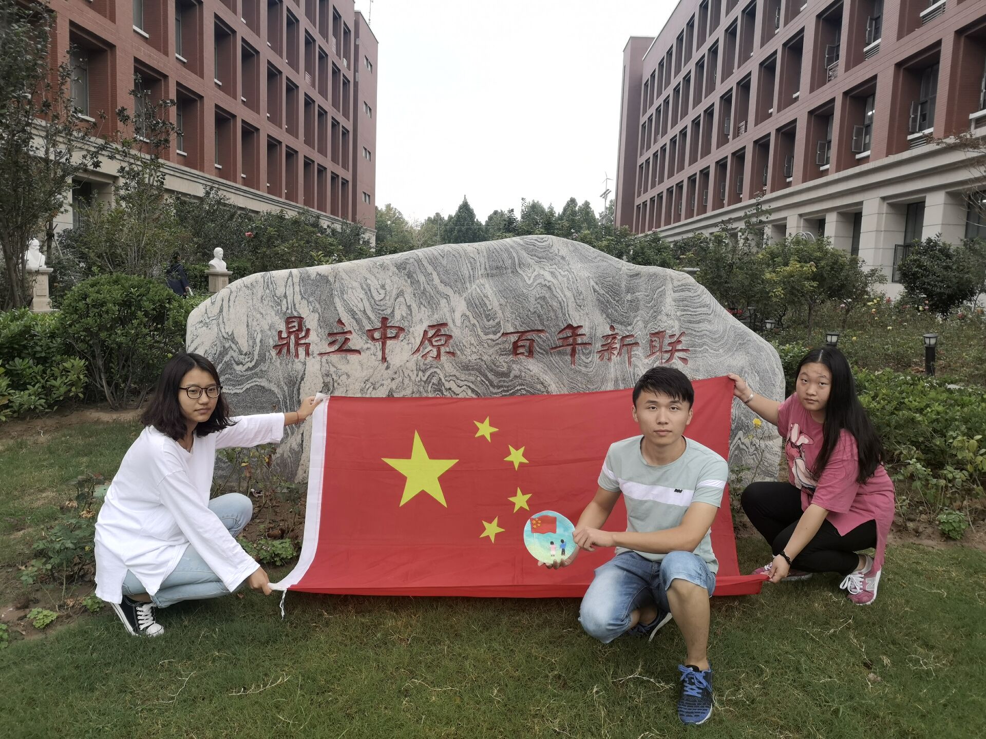 下午三点,庆祝活动正式开始。为迎接此次庆祝活动,同学们积极创新,以饱满的热情参与其中,提前制作了一批圆形手工作品,图案由国旗与少年组成,背景是蓝天白云与海滩,色调温馨和谐。他们将鲜艳的五星红旗灵活运用于设计之中,新颖独特,寓意深厚,充分体现出大学生积极向上的精神面貌与昂扬的爱国情怀。随后,同学们带着国旗和手工作品,在校内花园、图书馆、操场等地方进行合照,在校园的每个角落都留下了深刻的红色脚印与记忆,渲染了浓重的爱国氛围,充分体现出大学生坚定的爱国情怀。
