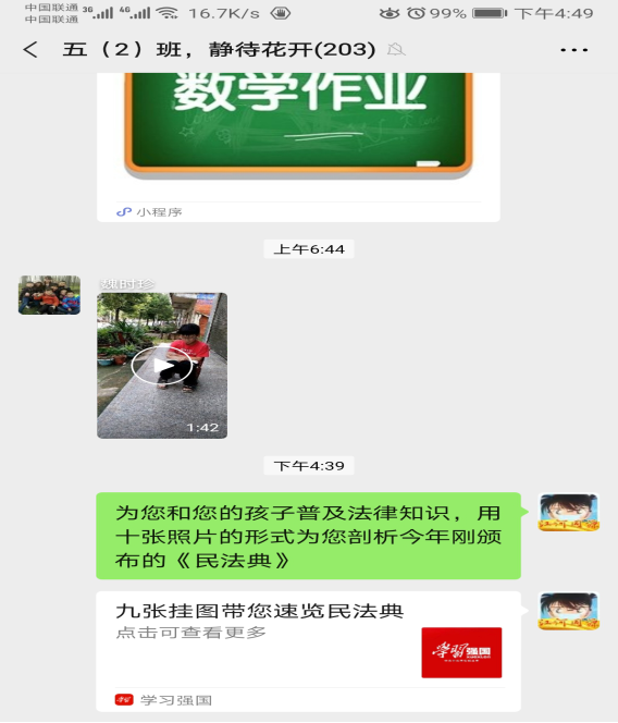 支教志愿服务组的青年志愿者们在队长的带领下向信阳市罗山县西街小学校长申请在贵校组织线上实践支教志愿服务活动,得到了杨校长的大力支持。杨校长在电话中告诉我们:志愿服务活动是一件好事,让我们在实践中获得经验。也提出了要求,让我们在活动的进行中注意沟通的方式,走进学生和家长,注意师风师德,树立自身良好形象,积极引导学生健康发展。随后,我们联系到了该校五年级二班的班主任,在班主任的许可下,我们进入了班级的微信群,在告知家长朋友们我们此行线上支教志愿服务的目的后,受到了家长朋友们的热烈欢迎和支持。我们为家长和学生认真讲解了“学习语文的方法”和线上辅导的有关事项,同时在线上发布了关于影响学生学习的调查问卷。