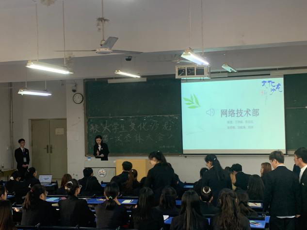 会议开始,主持人首先介绍出席团委老师、主席团。各部门负责人依次上台进行自我介绍,对20级新干事的加入表示欢迎,并对各自部门职能进行讲解。负责人代表对近期工作做了简要总结以及对未来工作的规划。接着19级优秀学生干事代表上台发言,讲述了近两个月对部门和文化沙龙的理解,以及对文化沙龙未来一学期的发展计划。最后,主席团代表后培帅学长进行了总结发言,点明了作为一名学生干部,我们需要良好的语言表达能力和学习能力,更要具备良好的政治素养,并倡导同学们在大学生活中积极努力,提高自身能力。在大会过程中,现场秩序,卫生,纪律整洁有序,每一位同学都认真听讲,十分投入。