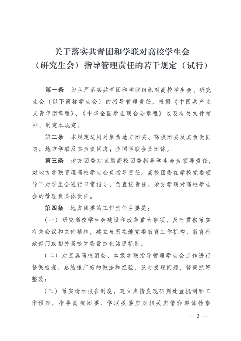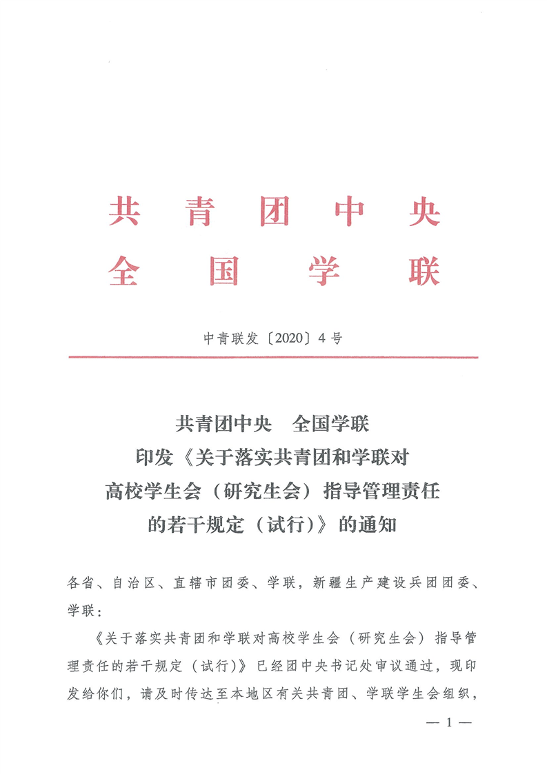 共青团中央 全国学联印发《关于落实共青团和学联对高校学生会(研究生会)指导管理责任的若干规定(试行)》的通知