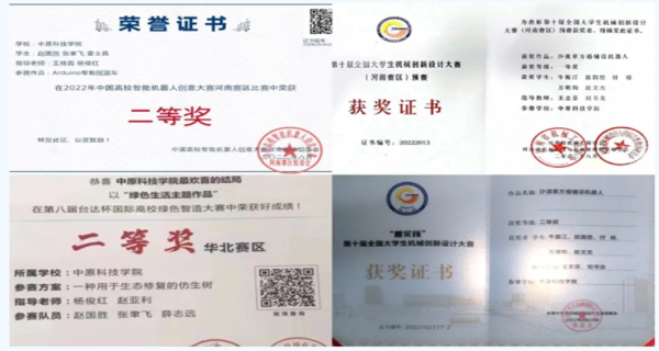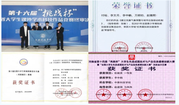取得了一定的成绩:机电工程学院原朋朋等15名学生的作品荣获2023年河南省“互联网+”大学生创新创业大赛二等奖;斩获第十六届“挑战杯”河南省大学生课外学术科技作品竞赛20项赛事奖,省级二等奖5项、省级三等奖15项;3项作品荣获2023年“汇创就创”河南省创意设计大赛1项省级一等奖,2项省级二、三等奖。