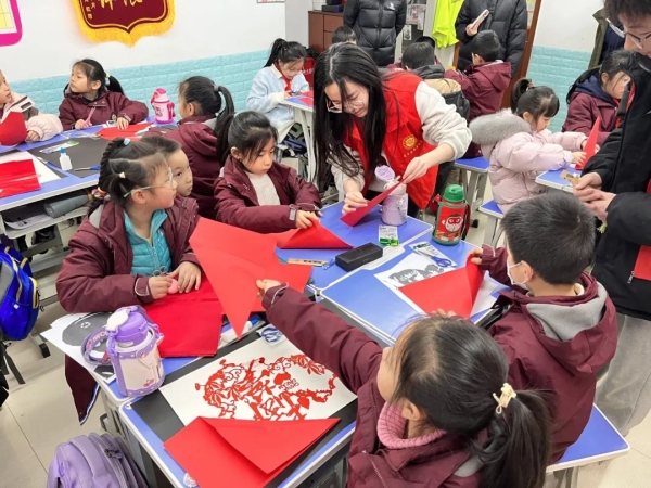 ▲志愿者教小朋友剪纸技术