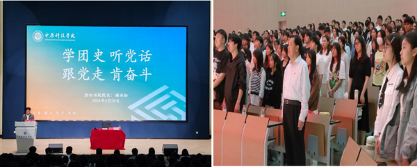 为深入学习贯彻习近平总书记关于青年工作的重要思想,加强对党的理论创新成果的理解,提高团员青年的思想政治素养,夯实基层团支部建设,增强团干部素质和团员归属感,由我校校团委主办、原初书院承办的“学团史、听党话、跟党走、肯奋斗”主题团课讲座,于4月28日晚上18:30在自强报告厅成功举办。本次讲座邀请我校原初书院院长谢冰松教授担任主讲人,原初书院执行副院长吴国良老师主持讲座,校团委全体成员、原初书院全体育人导师、全校各基层团干部和优秀团员代表等420余人到场参加。
