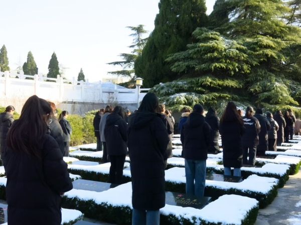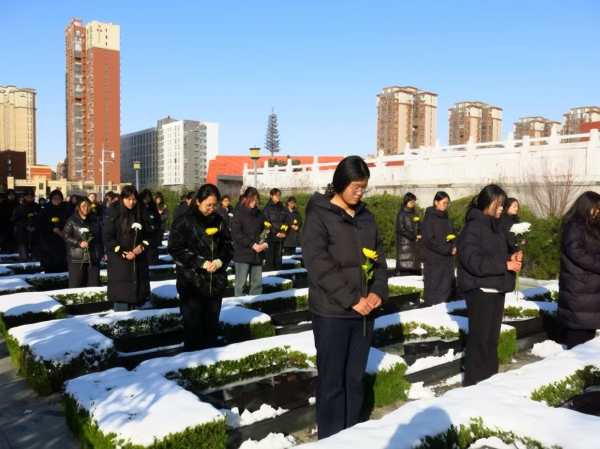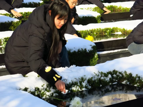 随后,同学们有序上前,向烈士墓敬献鲜花,轻轻擦拭墓碑上的积雪。一束束鲜花承载着对先烈的缅怀与敬仰,一次次擦拭传递着对历史的敬畏与传承。同学们驻足墓碑前,共同感悟革命精神,接受深刻的爱国主义教育。